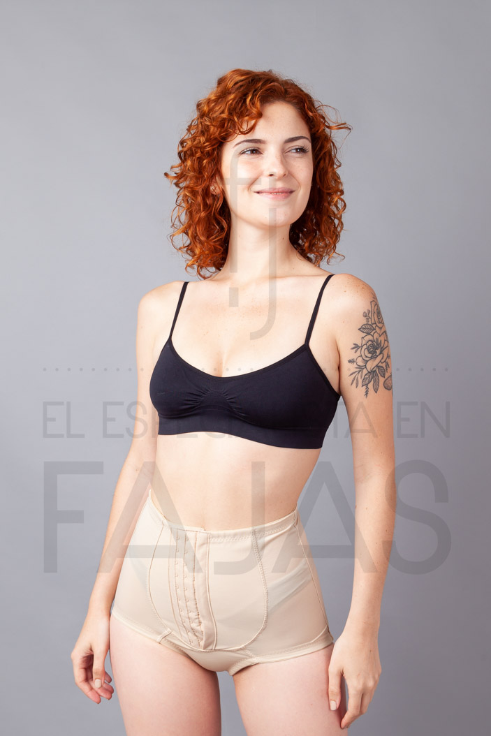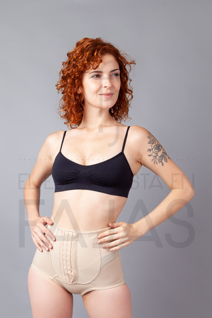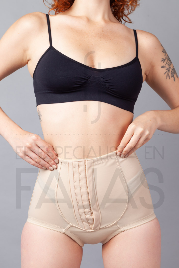 "trusa posquirúrgica con ganchitos para facilitar su uso , contiene abdomen bajo. Actualmente estamos fabricando este producto sin puntilla."
