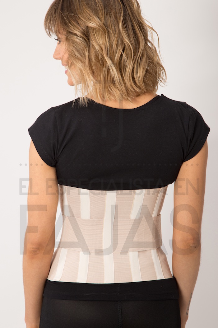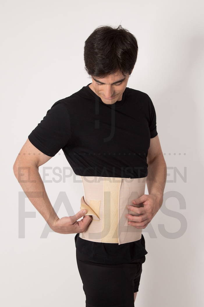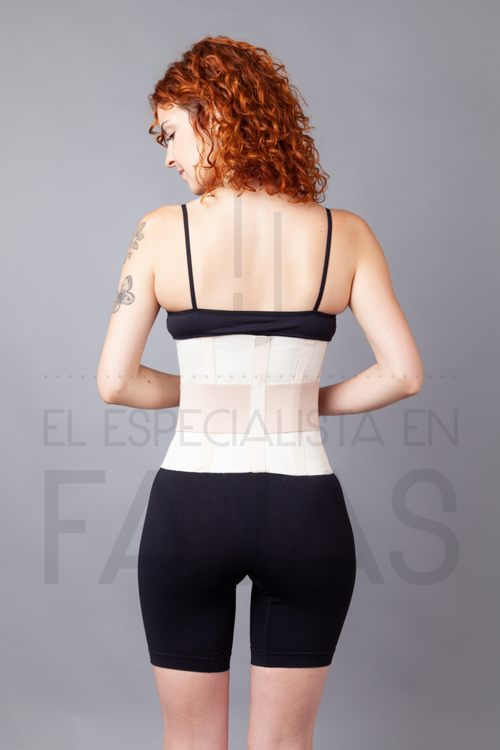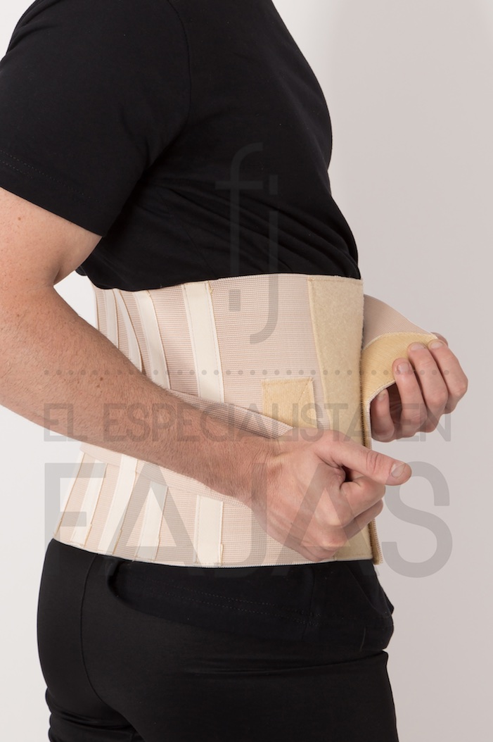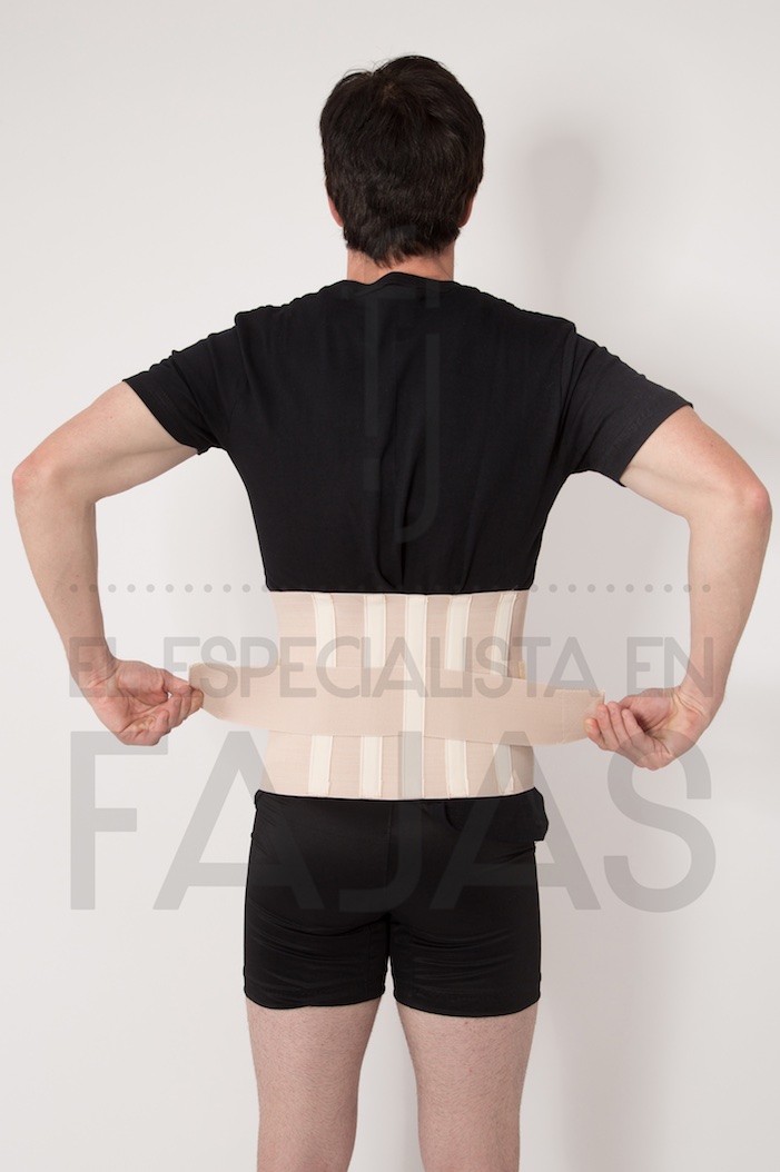 "Faja lumbar ballenada se utiliza en patologías como hernia de disco, desplazamiento, pinzamiento etc. de la zona sacro lumbar. Altura 24 cm, cierra con abrojo, 4 ballenas de metal y tensor."